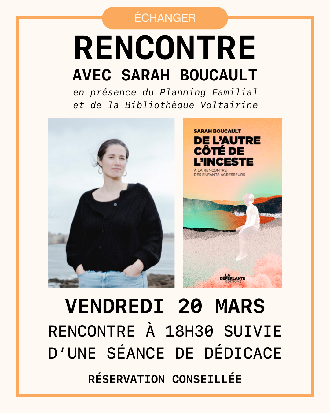 Le Planning familial 49 sera présent à la rencontre avec Sarah Boucault, Vendredi 20 mars prochain, autour de son ouvrage De l'autre côté de l'inceste.